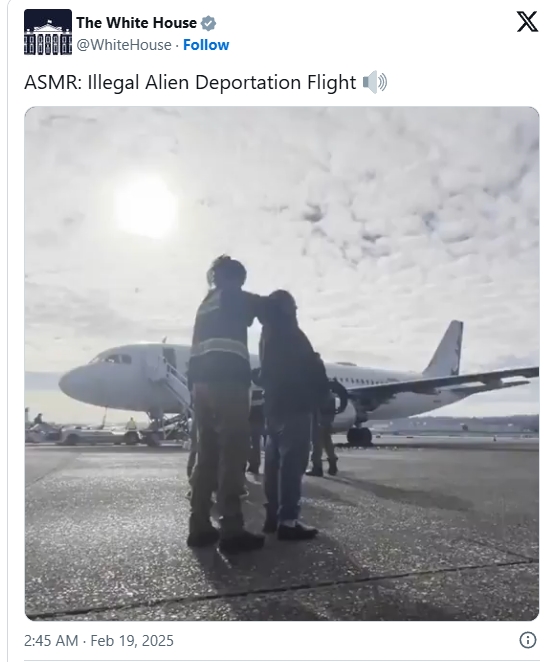 白宫给这段视频的配文为“ASMR:非法移民驱逐航班”。报道指出,ASMR是一个非临床术语,全称为“自发性知觉经络反应”,指的是一些人在观看包含不寻常声音(如耳语或手指敲击表面)的视频时,所体验到的一种愉悦感。