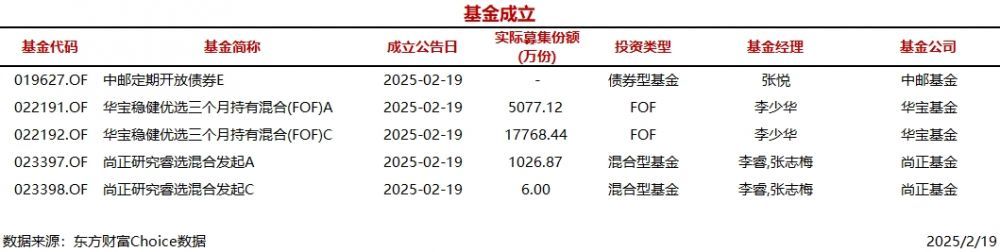 南方财经2月19日电,据东方财富Choice数据统计,今日共有5只基金公告成立(A/C类分开计算),包括2只FOF、2只混合型基金、1只债券型基金。