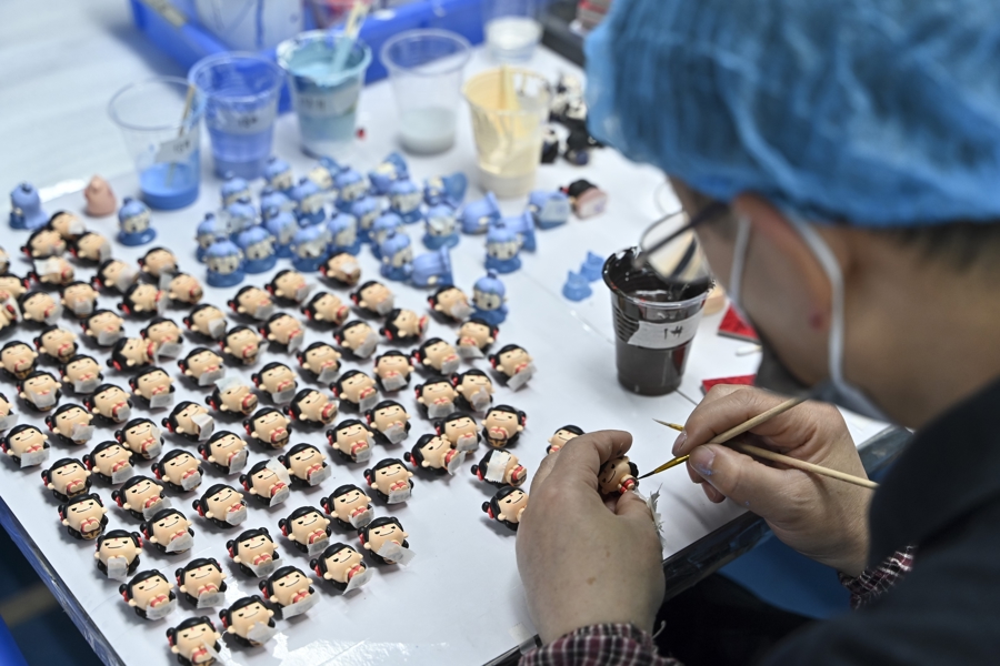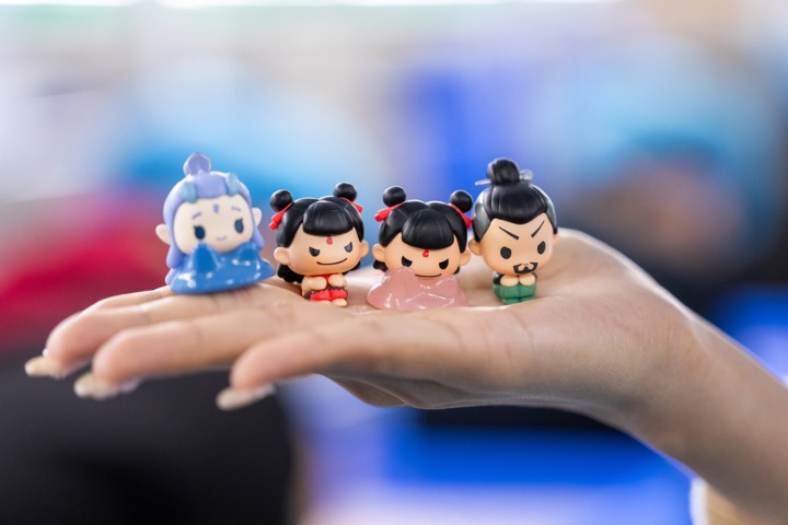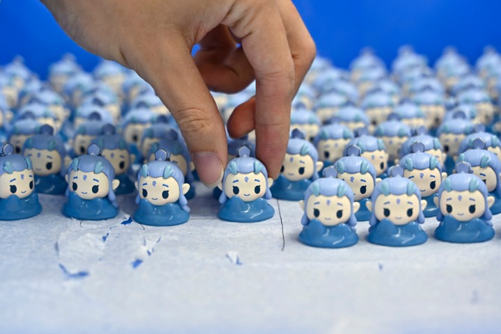 工作人员为《哪吒之魔童闹海》主题模型修色。
