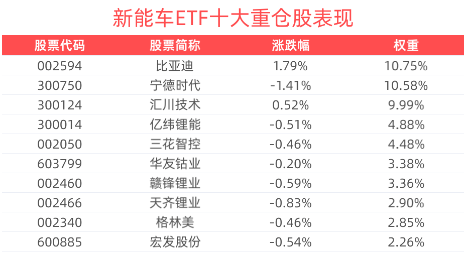 数据显示,截至2025年1月27日,中证新能源汽车产业指数(930997)前十大权重股分别为比亚迪(002594)、汇川技术(300124)、宁德时代(300750)、三花智控(002050)、亿纬锂能(300014)、华友钴业(603799)、赣锋锂业(002460)、格林美(002340)、天齐锂业(002466)、宏发股份(600885),前十大权重股合计占比56.3%。