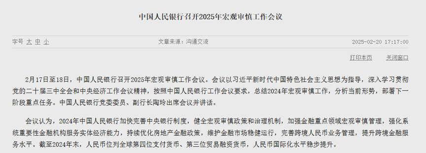 中国人民银行网站2月20日消息,2月17日至18日,中国人民银行召开2025年宏观审慎工作会议。会议要求,2025年宏观审慎工作要加强宏观经济金融分析研判,立足实体经济发展和人民群众对金融服务的需求,探索拓展中央银行宏观审慎与金融稳定功能,健全宏观审慎政策体系,创新宏观审慎政策工具,推动经济持续回升向好,维护金融市场稳健运行。完善房地产金融管理,助力房地产市场止跌回稳,支持构建房地产发展新模式。