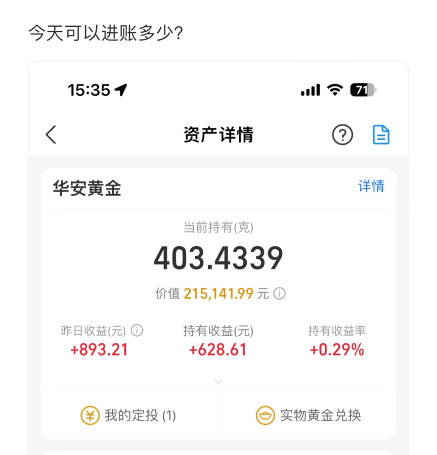 有投资者说:“黄金的收益真的是无法想象,还有空间吗?虽然就只有2克。”还有人表示,之前小额定投黄金尝到甜头,可惜买得太少了。如果有时光机,想回到过去,重仓黄金。也有人晒出自己的收益,日赚近900元。
