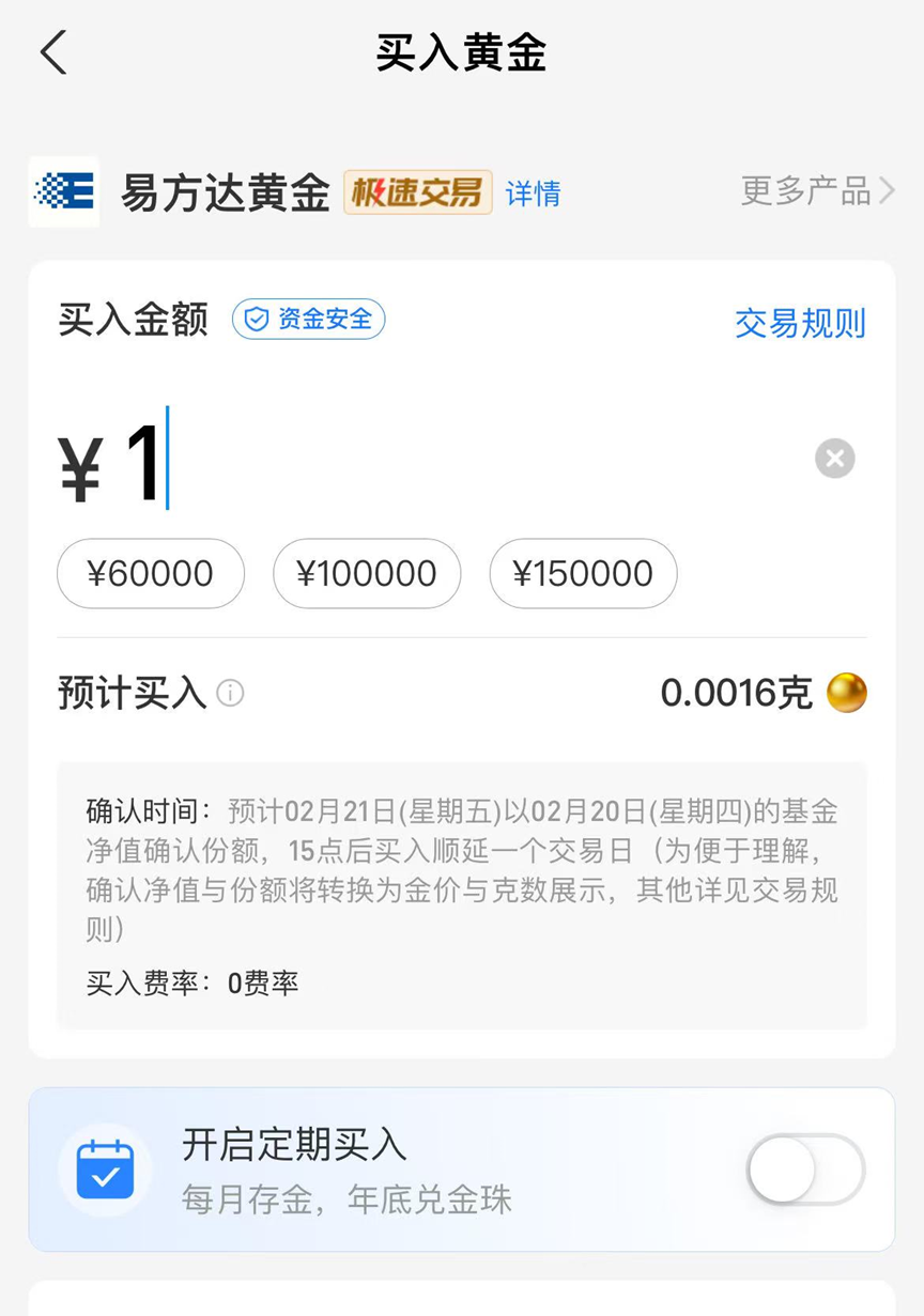 以易方达黄金ETF为例,1元可购买0.0016克黄金,投资者在支付宝上进行操作时,持有天数在7天(含)之内的费率为1.50%,而大于7天且小于30天为0.10%,若持有天数大于30天则为零。