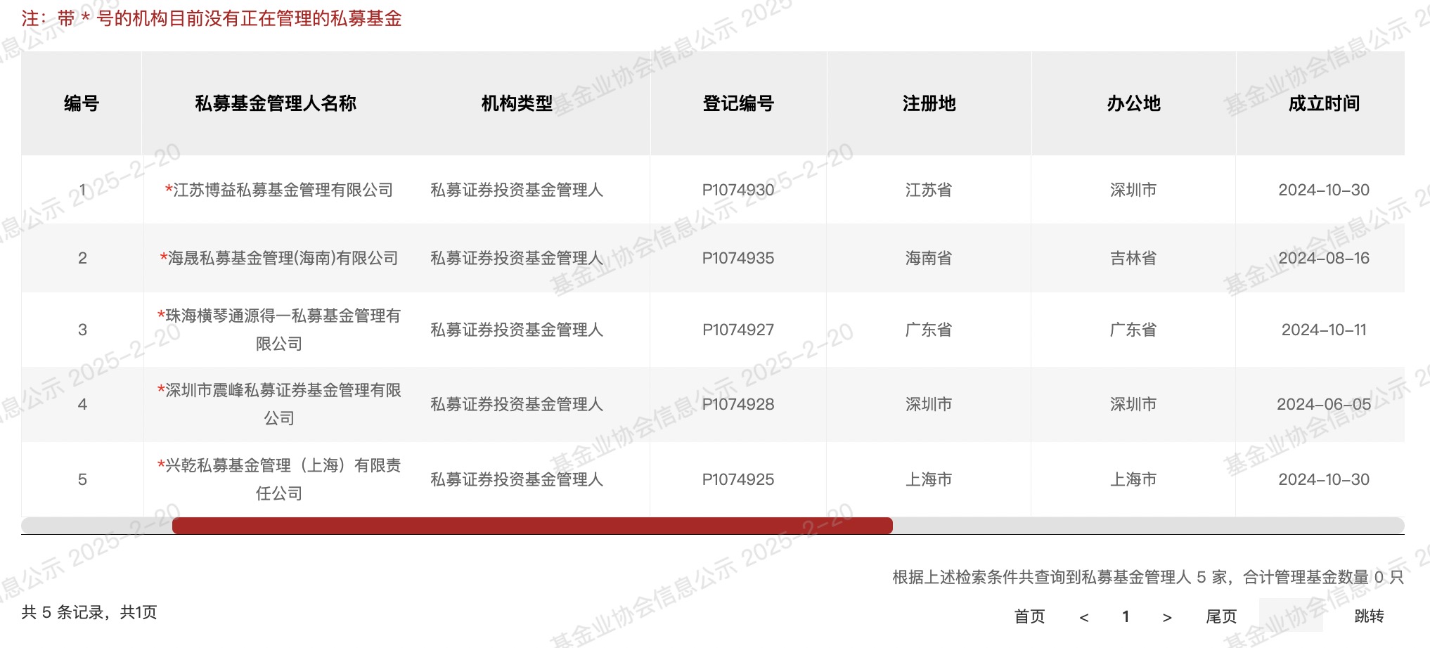 中基协数据显示,1月新登记的5家私募证券投资基金包括:江苏博益私募基金管理有限公司(以下简称:博益基金)、海晟私募基金管理(海南)有限公司(以下简称:海晟基金)、珠海横琴通源得一私募基金管理有限公司(以下简称:通源得一)、深圳市震峰私募证券基金管理有限公司(以下简称:震峰基金)、兴乾私募基金管理(上海)有限责任公司(以下简称:兴乾基金),都有成立在2024年下半年,目前也均无在管的私募产品。