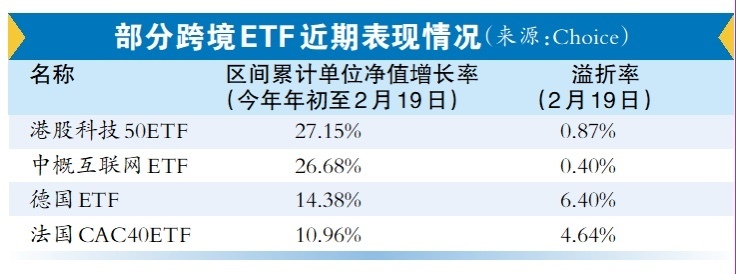 需要注意的是,跨境ETF高溢价情况频发(当市场价大幅高于基金份额参考净值时,即出现高溢价),Choice数据显示,截至2月19日,11只跨境ETF的溢价率超5%,其中标普消费ETF的溢价率高达40%以上。