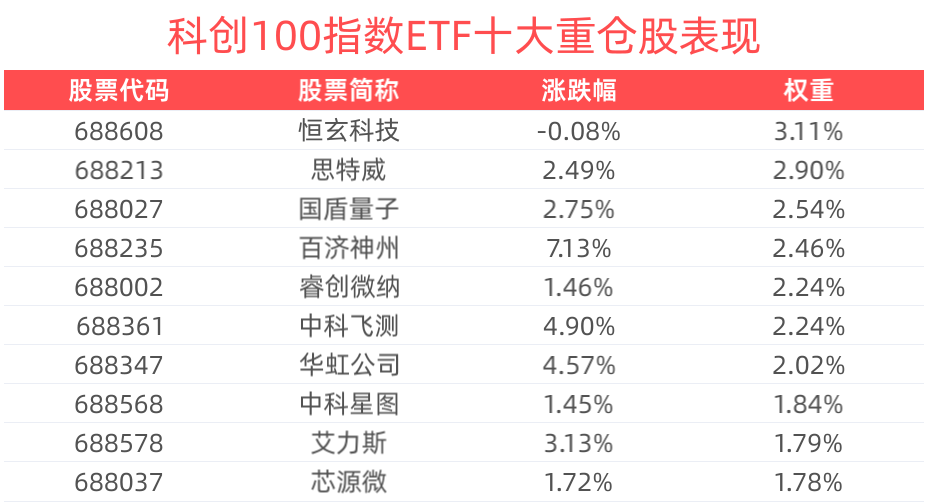 数据显示,截至2025年1月27日,上证科创板100指数(000698)前十大权重股分别为恒玄科技(688608)、思特威(688213)、百济神州(688235)、睿创微纳(688002)、中科飞测(688361)、国盾量子(688027)、绿的谐波(688017)、艾力斯(688578)、华虹公司(688347)、纳芯微(688052),前十大权重股合计占比24.35%。