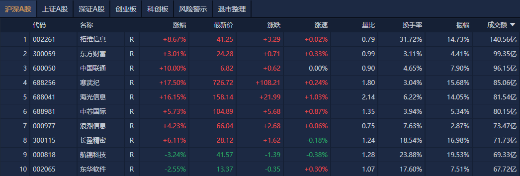 沪深两市半日成交额1.35万亿元,较上个交易日放量2212亿元。个股方面,南财金融终端显示,拓维信息成交额超140亿元居首,东方财富、中国联通、寒武纪成交额靠前。