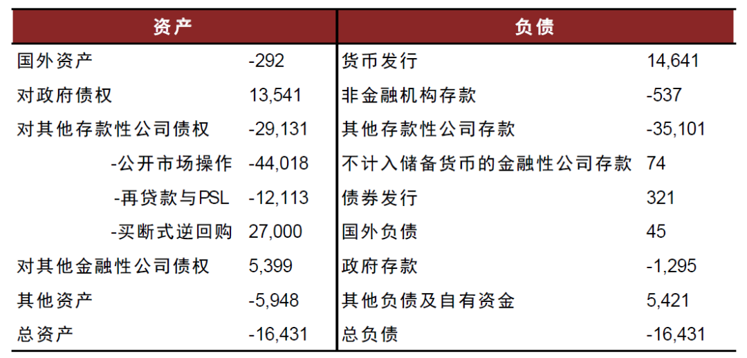 三是再贷款、再贴现与PSL,其投放对应到央行的资产负债表也是资产端对其他存款性公司债权增加。