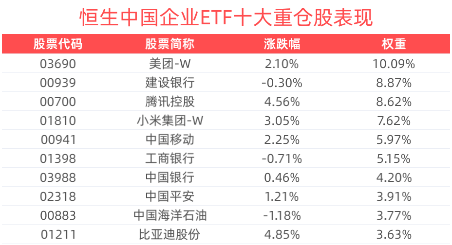 数据显示,截至2025年2月20日,恒生中国企业指数(HSCE)前十大权重股分别为阿里巴巴-W(09988)、小米集团-W(01810)、腾讯控股(00700)、建设银行(00939)、美团-W(03690)、中国移动(00941)、工商银行(01398)、比亚迪股份(01211)、中国银行(03988)、中国平安(02318),前十大权重股合计占比61.76%。
