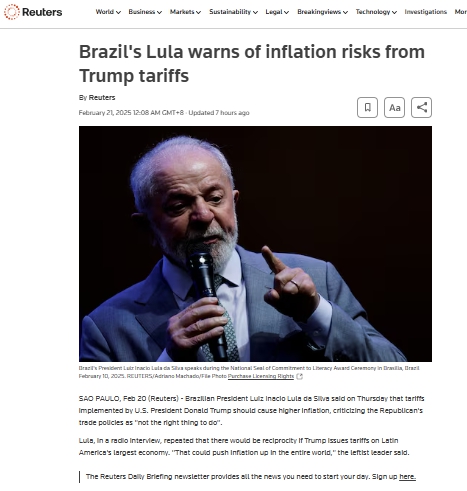 中新网2月21日电 在美国总统特朗普近日宣布将对进口到美国的钢铁、汽车等产品加征关税后,据路透社报道,巴西总统卢拉20日表示,若特朗普对巴西加征关税,将触发巴西对美国的对等政策,这可能推高全球通货膨胀率。