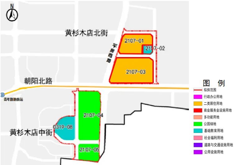 朝阳区平房乡黄杉木店平房区城中村改造项目2107-01、02、03地块位于朝阳区平房乡,该地块用地规模8.96公顷,规划地上建筑面积22.40万平方米,规划用途R2二类居住用地、A334托幼用地。地处东四环与东五环之间,临近地铁6号线青年路站及朝阳北路、东五环路、京通快速路,交通便捷。项目周边有朝阳大悦城、万象汇、民航总医院等,周边教育、医疗及商业配套资源丰富。