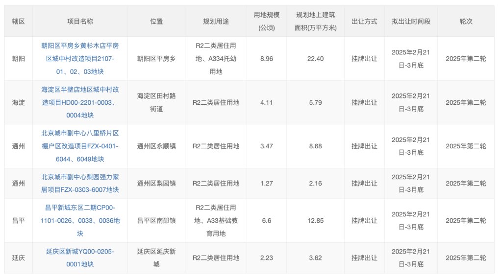 2月21日,北京市规划和自然资源委员会网站发布2025年度第二轮拟供应商品住宅用地清单,共涉及6宗地,土地面积约27公顷,建筑规模约56万平方米,上述用地将于2025年3月底前供应。
