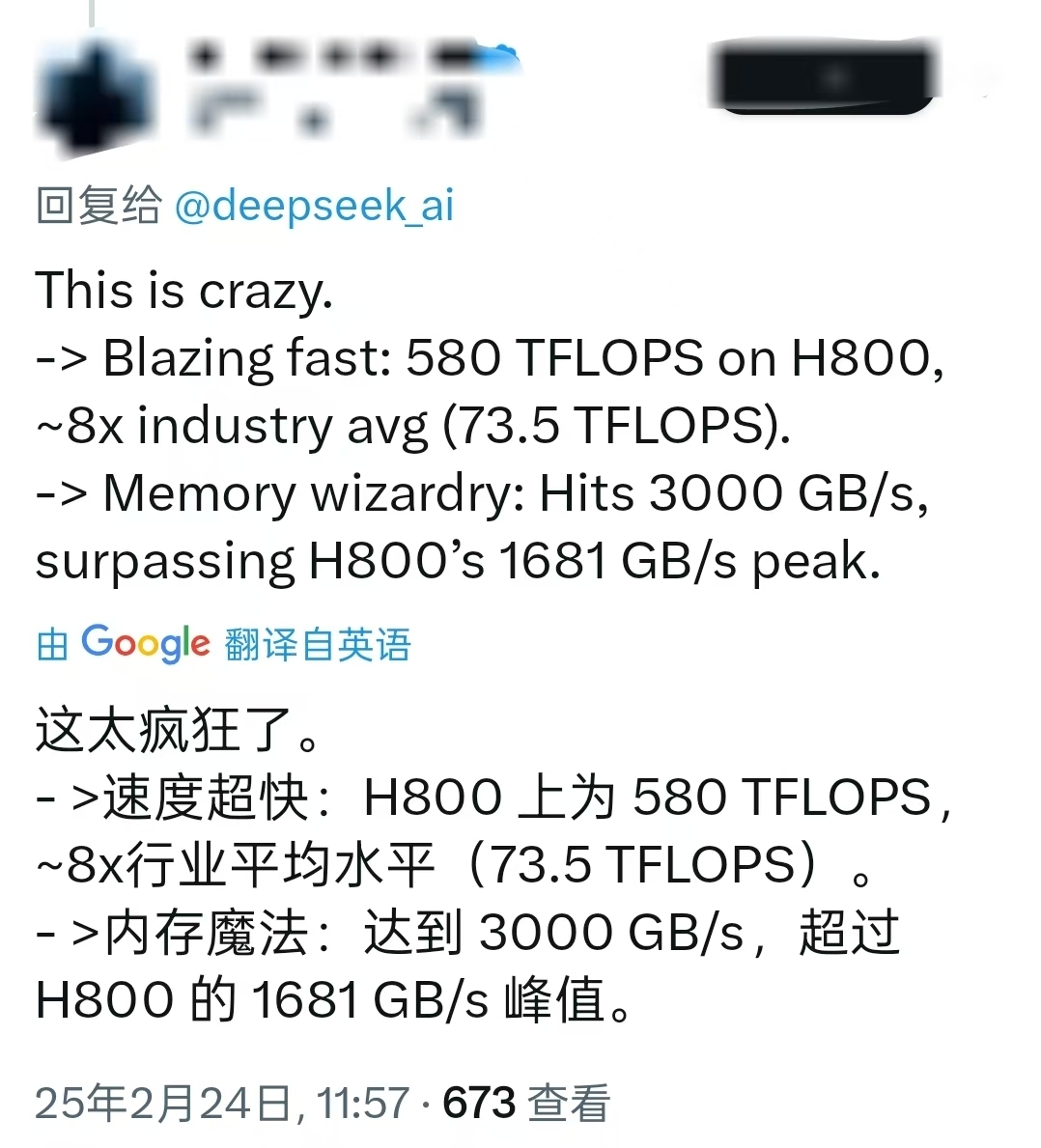 DeepSeek表示,其在H800上能实现3000 GB/s的内存带宽&580 TFLOPS的计算性能。