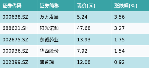 截至收盘,CRO/CMO主题涨跌幅最高的五只股票为:万方发展(000638.SZ)、阳光诺和(688621.SH)、东诚药业(002675.SZ)、华西股份(000936.SZ)与海普瑞(002399.SZ)。详情见下表: