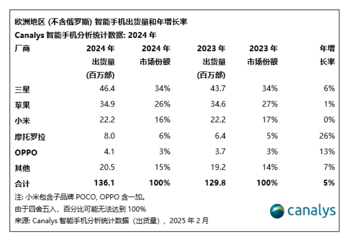 而这些风波正在重塑欧洲市场的格局。Canalys最新数据显示,2024年,三星(34%)和苹果(26%)的份额加总高达60%;国产手机厂商中,小米在欧洲的市场份额为16%,摩托罗拉和OPPO的市场份额占比分别为6%和3%。不过,Counterpoint Research数据显示,2019年以前,中国品牌在欧洲的整体市场份额最高峰时接近40%。