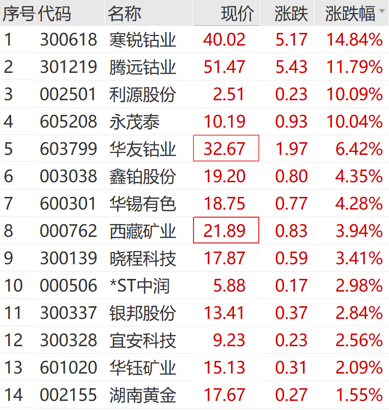 2月25日上午,有色金属板块拉升,钴矿概念股逆市走高。寒锐钴业、腾远钴业涨超10%,利源股份、永茂泰涨停,华友钴业涨超6%。