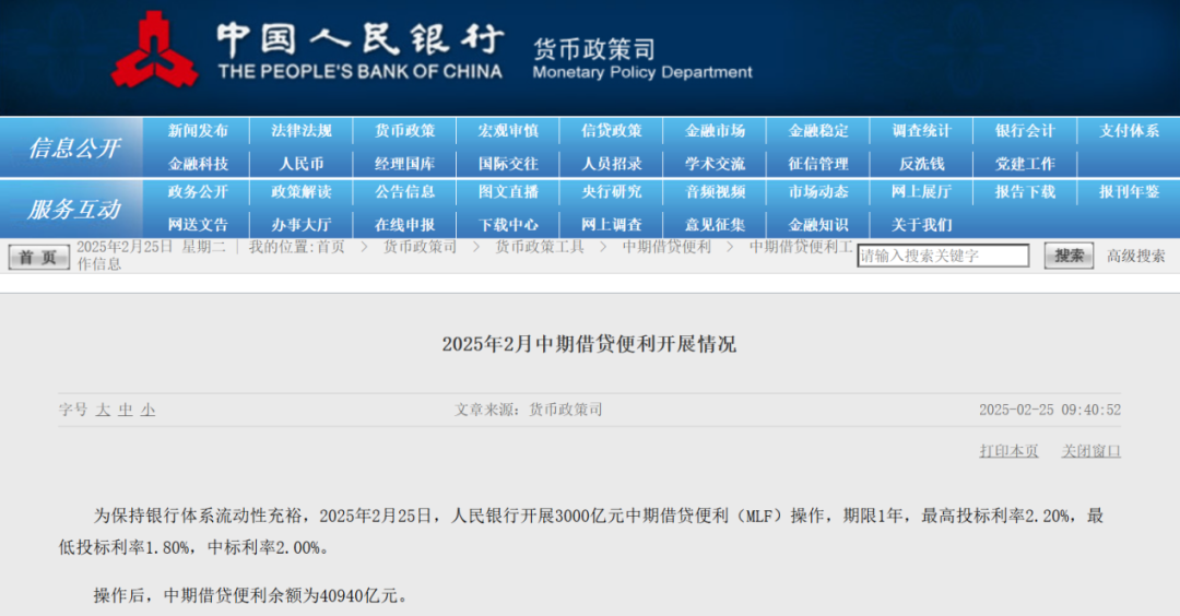 首先来看央行动作:为保持银行体系流动性充裕,2月25日,人民银行开展3000亿元中期借贷便利(MLF)操作,期限1年,中标利率为2.00%,维持不变。操作后,中期借贷便利余额为40940亿元。