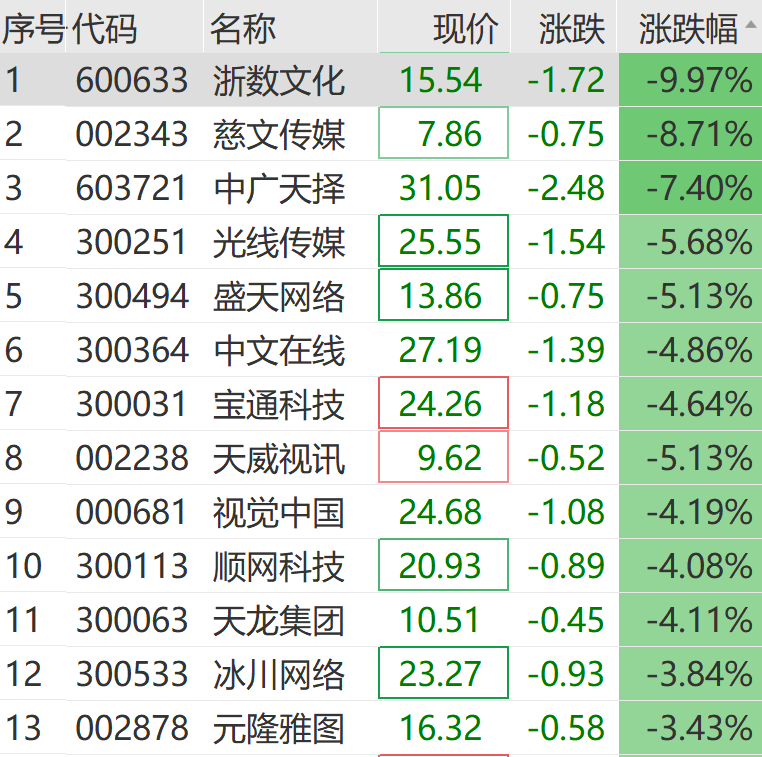 另外,上午传媒股普遍不振。浙数文化盘初跌停,慈文传媒、中广天择、光线传媒、天威视讯等多股走低。