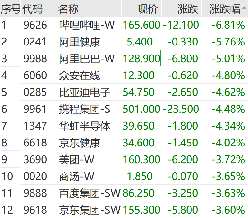 港股早间大幅低开,恒生科技指数大跌4.3%。上午港股市场震荡上行,截至发稿跌幅有所收窄,恒生科技指数跌幅仍超2%。哔哩哔哩、阿里健康、阿里巴巴等跌超5%,领跌恒生科技指数成份股。