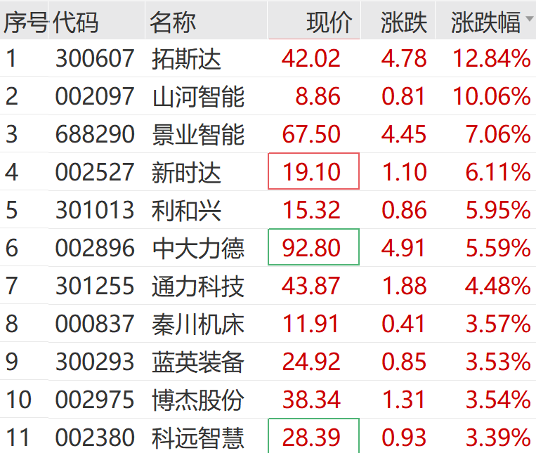 此外,上午机器人概念股局部反弹,拓斯达盘中一度涨超16%,股价再创新高;山河智能涨停,新时达、中大力德、利和兴等多股跟涨。