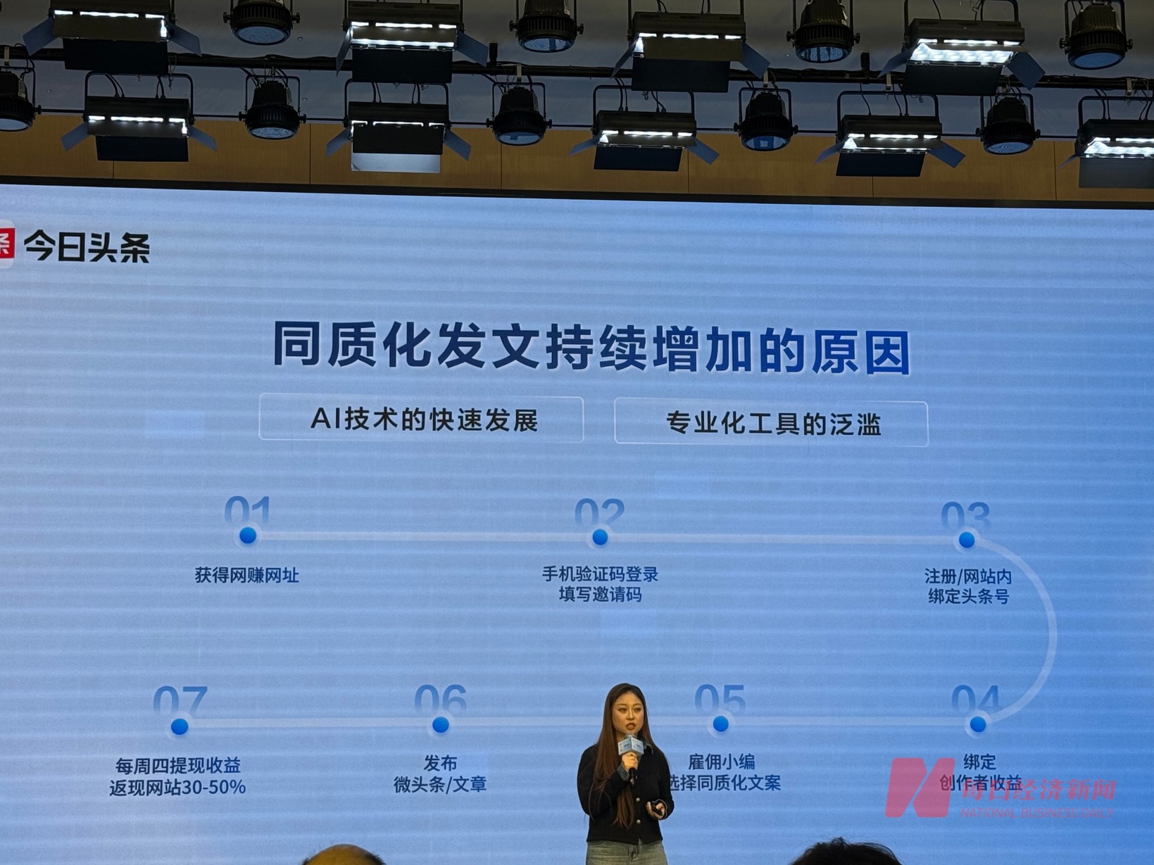 记者在活动现场了解到,2024年,今日头条对超93万条低质AI内容进行了识别和管控;对近3万个利用AI批量发布虚假低质内容或恶意抄袭、洗稿他人的账号进行了处罚;站内用户对AI相关的负向反馈声量,从年初的每天近28条降低至目前的每天1到2条。