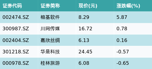 截至收盘,智慧政务主题涨跌幅最高的五只股票为:榕基软件(002474.SZ)、川网传媒(300987.SZ)、嘉欣丝绸(002404.SZ)、华是科技(301218.SZ)与桂林旅游(000978.SZ)。详情见下表: