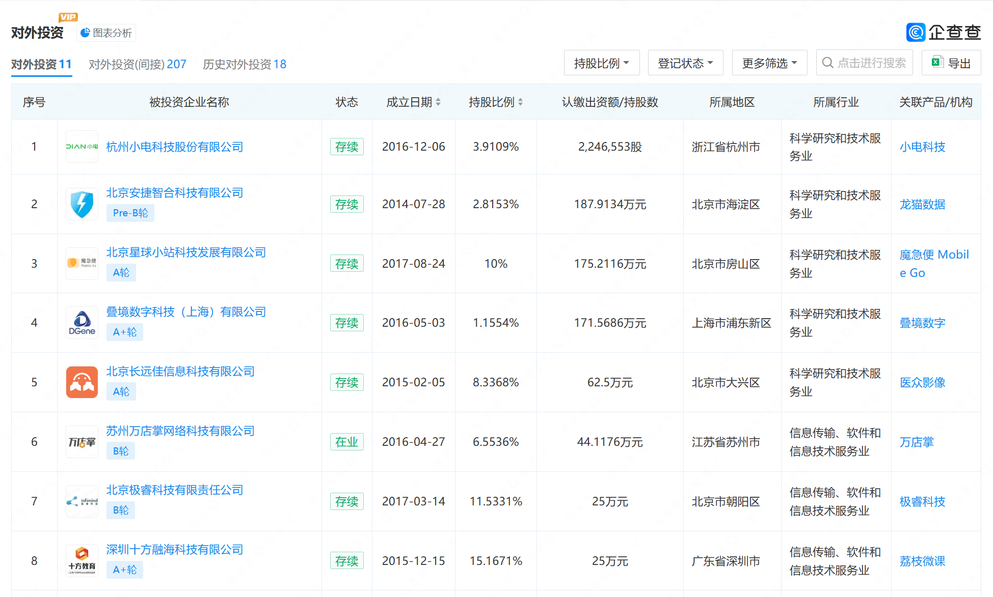 企查查显示,金沙江朝华对外投资11家企业,剔除风险企业3家,剩余8家。8家企业的关联品牌包括小电科技、龙猫数据、魔急便Mobile Go、叠境数字、医众影像、万店掌、极睿科技、荔枝微课。