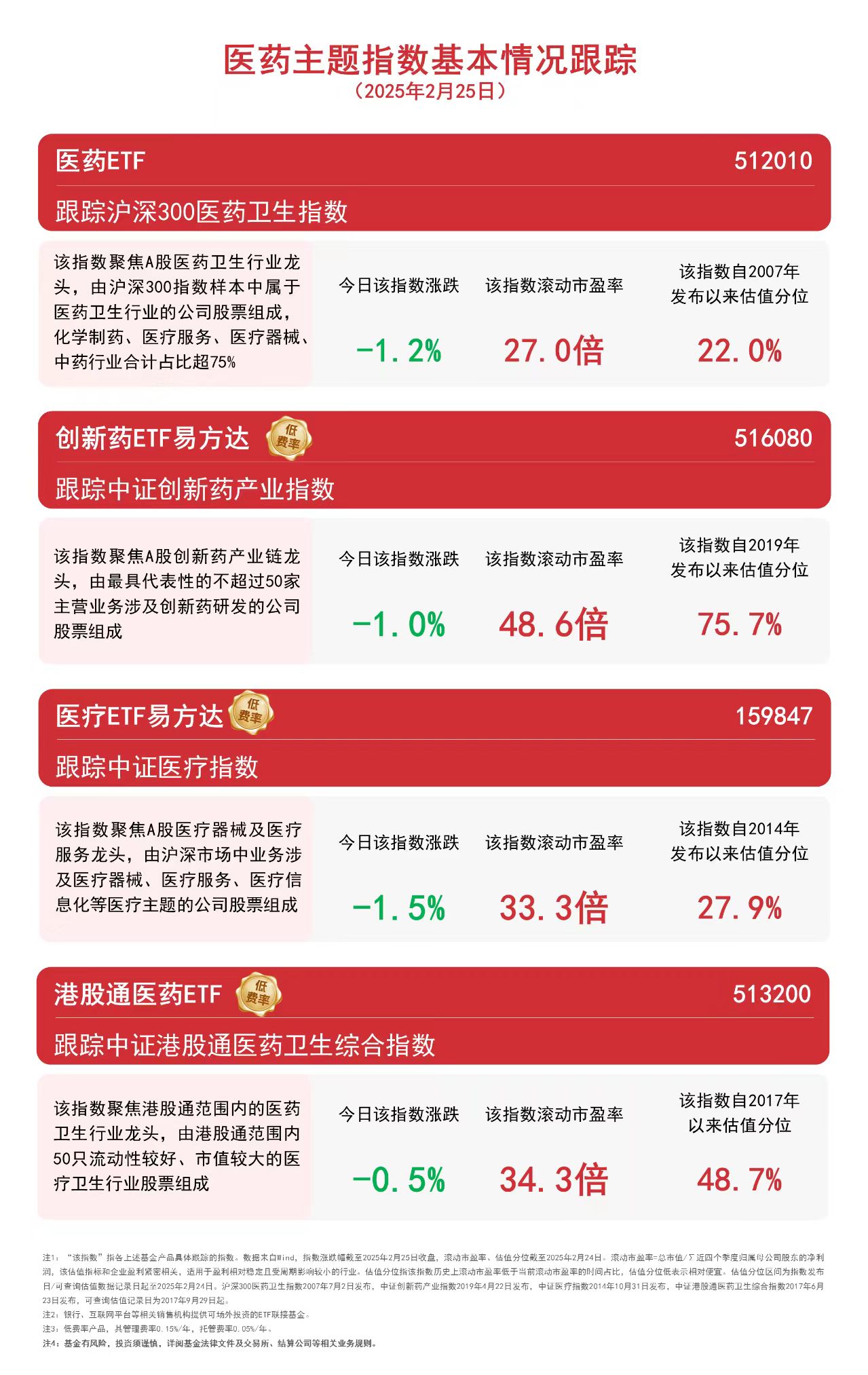 截至收盘,中证港股通医药卫生综合指数下跌0.5%,中证创新药产业指数下跌1.0%,沪深300医药卫生指数下跌1.2%,中证医疗指数下跌1.5%。