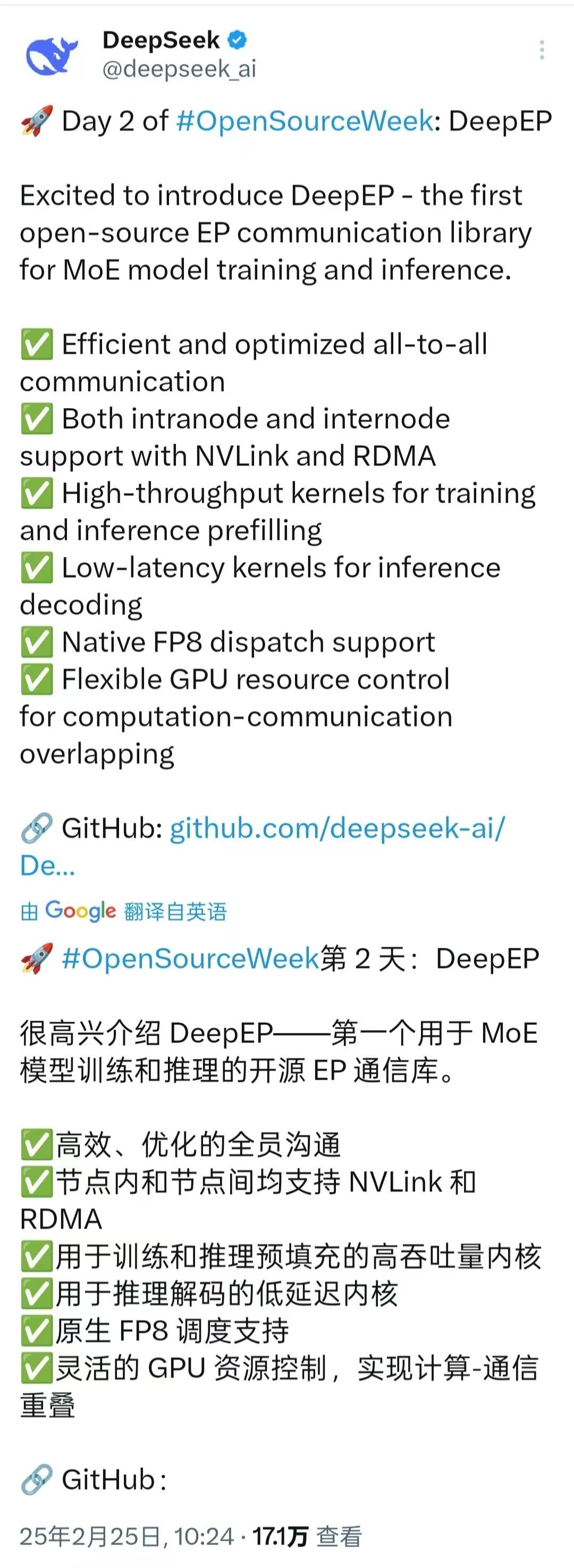 2月25日,DeepSeek在“开源周”的第二日开源了DeepEP通信库,这是第一个用于MoE模型训练和推理的开源EP通信库。