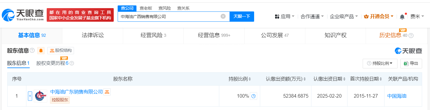南方财经2月25日电,天眼查App显示,近日,中海油广西销售有限公司发生工商变更,注册资本由约2.1亿人民币增至约5.2亿人民币,增幅约146%。该公司成立于2015年11月,法定代表人为叶鑫鑫,经营范围含成品油批发、成品油零售、危险化学品经营、烟草制品零售、酒类经营、食品销售等,由中海油广东销售有限公司全资持股。
