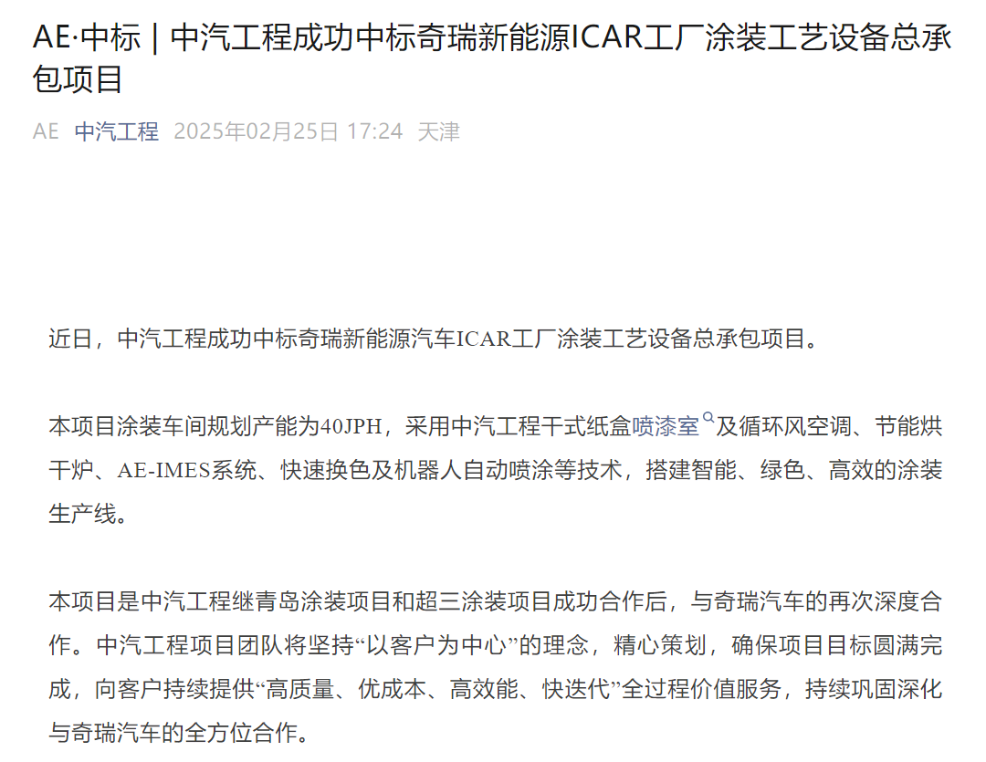 中汽工程中标奇瑞新能源ICAR工厂涂装工艺设备总承包项目