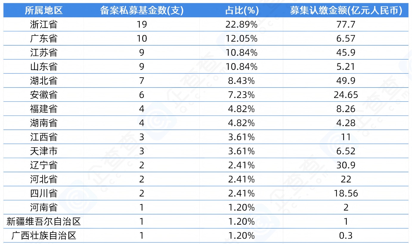 上证报中国证券网讯 企查查数据显示,上周(2.17-2.23)中国证券投资基金业协会(简称“中基协”)新备案私募股权、创业投资基金共83支,累计募集认缴金额314.76亿元人民币。从基金所属地区分布看,新备案基金数量最多是浙江省,新备案19支基金,合计占比22.89%;累计募资认缴金额最高是浙江省、湖北省和江苏省,占比为浙江省24.69%、湖北省15.85%、江苏省14.58%。其中募集认缴金额较大的私募基金:宁波甬欣韦豪四期半导体产业投资合伙企业(有限合伙),规模35亿元,由韦尔股份全资企业绍兴韦豪与宁波市甬欣基金合伙企业(有限合伙)、余姚阳明股权投资基金有限公司、余姚经济开发区建设投资发展有限公司、浙江余姚工业园区开发建设投资有限公司等发起设立。该基金聚焦于泛半导体产业先进技术、工艺、产品领域。