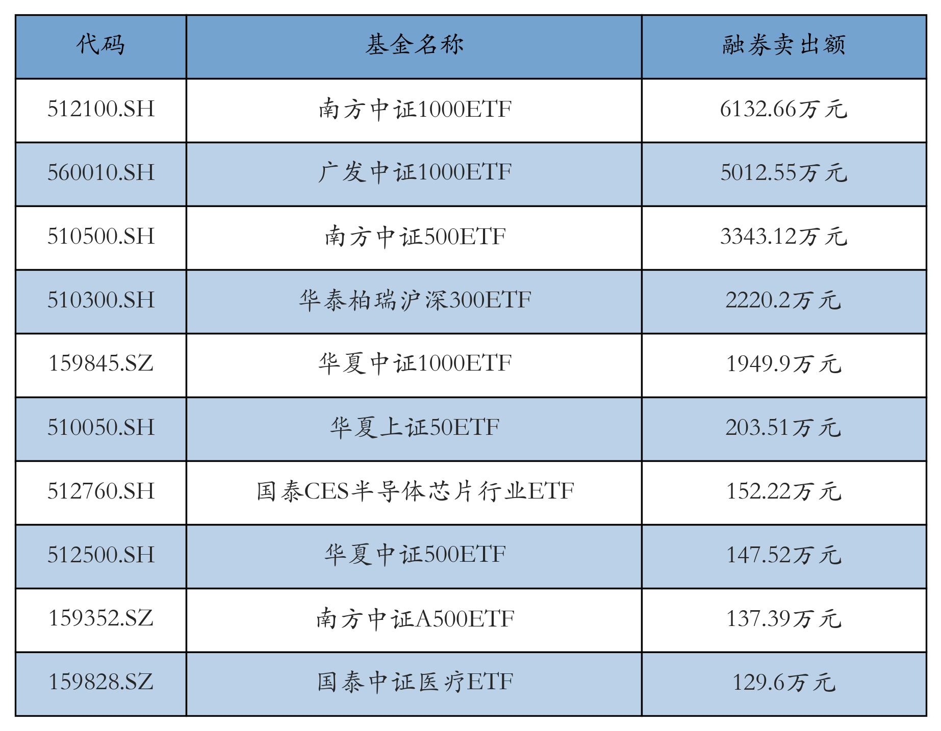 2月25日ETF融券卖出额前三位分别为:南方中证1000ETF(6132.66万元)、广发中证1000ETF(5012.55万元)和南方中证500ETF(3343.12万元),前10具体见下表: