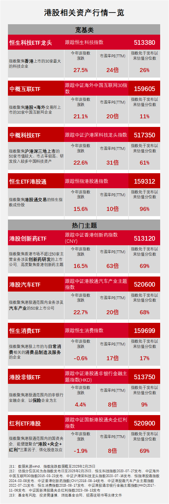对于港股走势,中信证券认为,即便在此轮港股上涨后,截至2月21日,目前恒生指数和恒生科技指数的动态PE分别为10.4/18.7倍,处于历史44.8%/30.7%分位数。而港股主要指数2025年的业绩预期在三季报后也呈现上修趋势,自去年11月底以来,Bloomberg一致预期显示,恒生科技的2025年收入和净利润预期分别上修了7.7%和6.2%。综合来看,在AI叙事持续催化、企业基本面预期上修、全球资金轮动的背景下,后续港股大概率将延续2024年以来的反转行情。