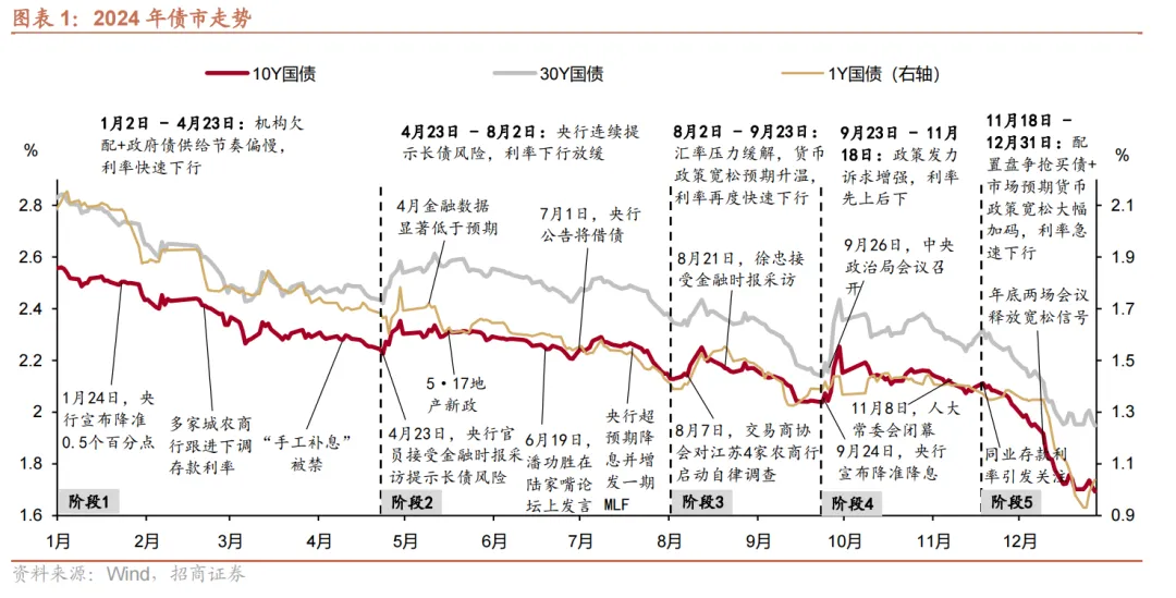 根据招商证券固收团队的分析,2024年债市走势中有四个明显的拐点,分别为4月23日、8月初、9月23日以及11月18日。