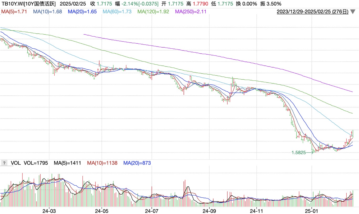 回顾2024年,伴随央行降准降息以及宽松的资金环境,10年国债活跃券收益率从年初的2.56%一路下滑至年末的1.66%,催生了跨越全年的债牛行情。2024年12月,仅一个月的时间,10年期国债收益率就突破了2%关口,并不断快速下行突破1.8%、1.7%直至接近1.6%。