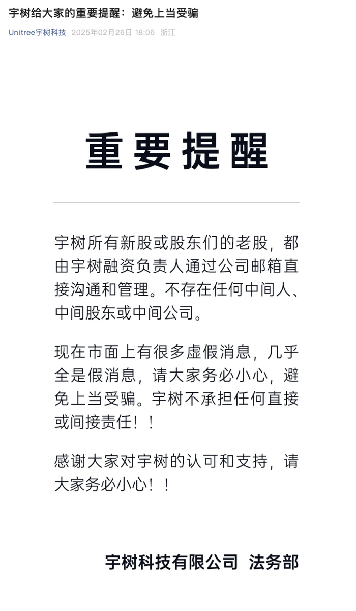 2月26日,宇树科技官微发布提醒:宇树所有新股或股东们的老股,都由宇树融资负责人通过公司邮箱直接沟通和管理。不存在任何中间人、中间股东或中间公司。现在市面上有很多虚假消息,几乎全是假消息。