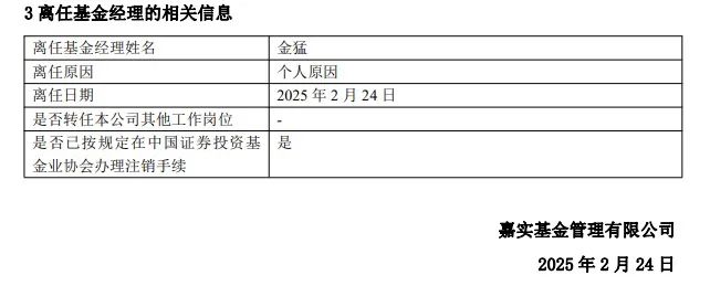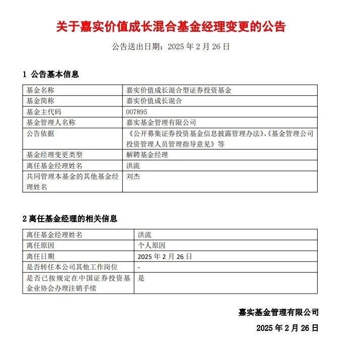 2月26日早间,嘉实基金发布基金经理变更公告,基金经理洪流卸任了4只基金的管理,公告并未显示其留任其他岗位,并已按规定在中基协办理注销手续。基金经理金猛也因个人原因于2月24日离任,并已卸任所管全部基金。