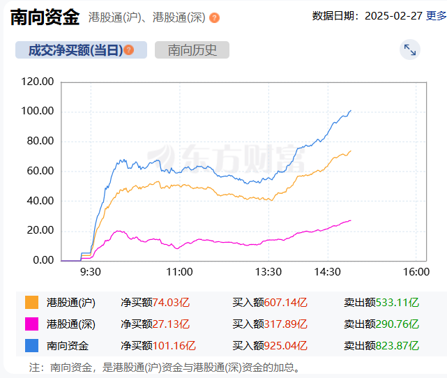 南向资金净买入达100亿港元