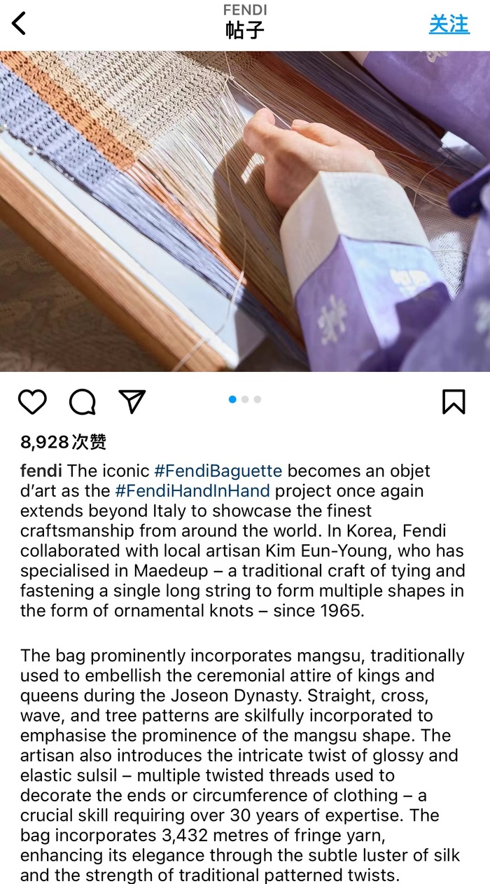 具体而言,2024年11月26日,Fendi在其Instagram上发布视频及照片,宣传其与韩国手工艺人合作的新款手袋。该手袋以绳结为灵感,形态酷似中国结,但Fendi的宣传材料中将其称为“韩国传统结”。