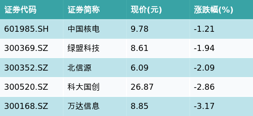 截至收盘,MLOps主题涨跌幅最高的五只股票为:中国核电(601985.SH)、绿盟科技(300369.SZ)、北信源(300352.SZ)、科大国创(300520.SZ)与万达信息(300168.SZ)。详情见下表: