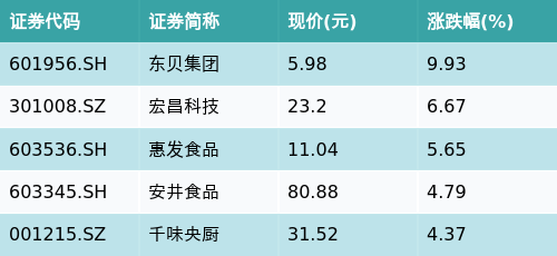 截至收盘,家电零部件主题涨跌幅最高的五只股票为:东贝集团(601956.SH)、宏昌科技(301008.SZ)、惠发食品(603536.SH)、安井食品(603345.SH)与千味央厨(001215.SZ)。详情见下表: