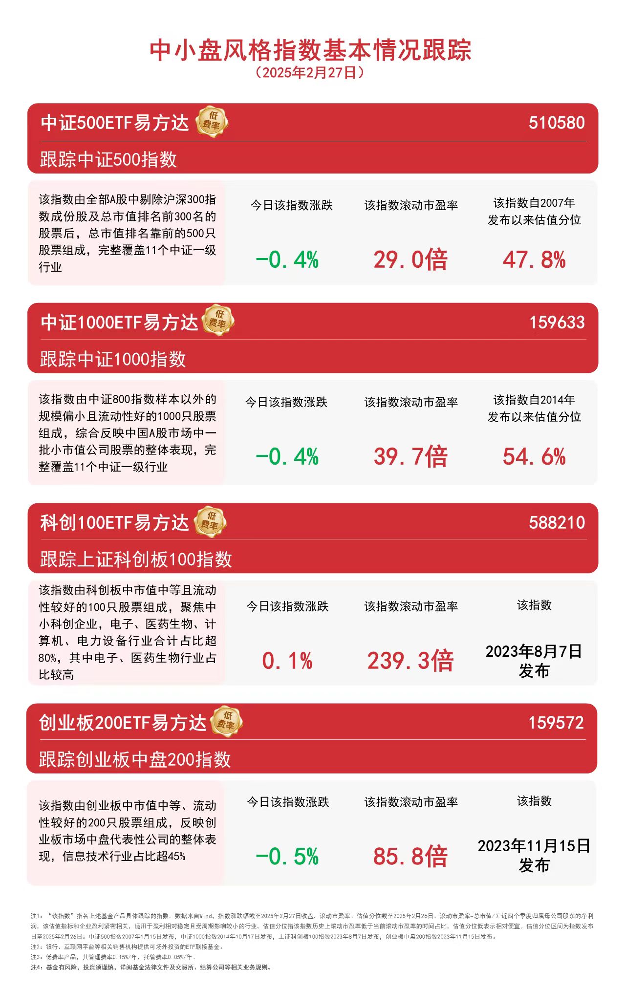 指数今日涨跌不一,关注中证1000ETF易方达(159633)、科创100ETF易方达(588210)等后续走势