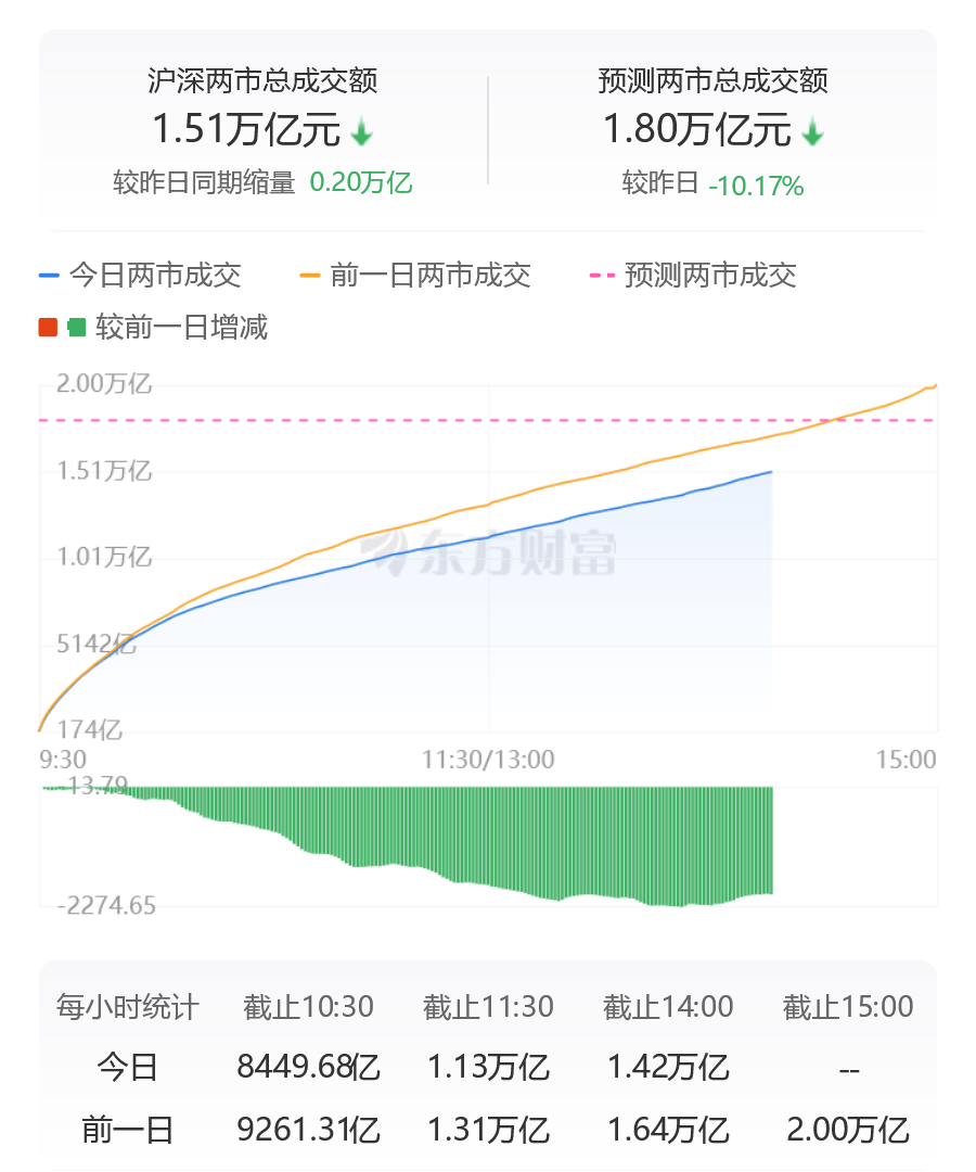 沪深两市成交额连续第17个交易日突破1.5万亿,较昨日此时缩量超2000亿。