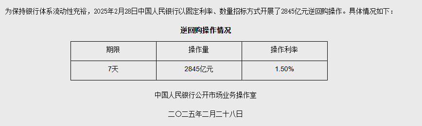 【大河财立方消息】2月28日,中国央行今日开展2845亿元7天期逆回购操作,操作利率1.50%。因今日有1825亿元7天期逆回购到期,当日实现净投放1020亿元。