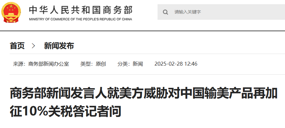 问:美国东部时间2月27日,美方威胁将于3月4日起以芬太尼为由对中国输美产品再加征10%关税。中方对此有何评论?