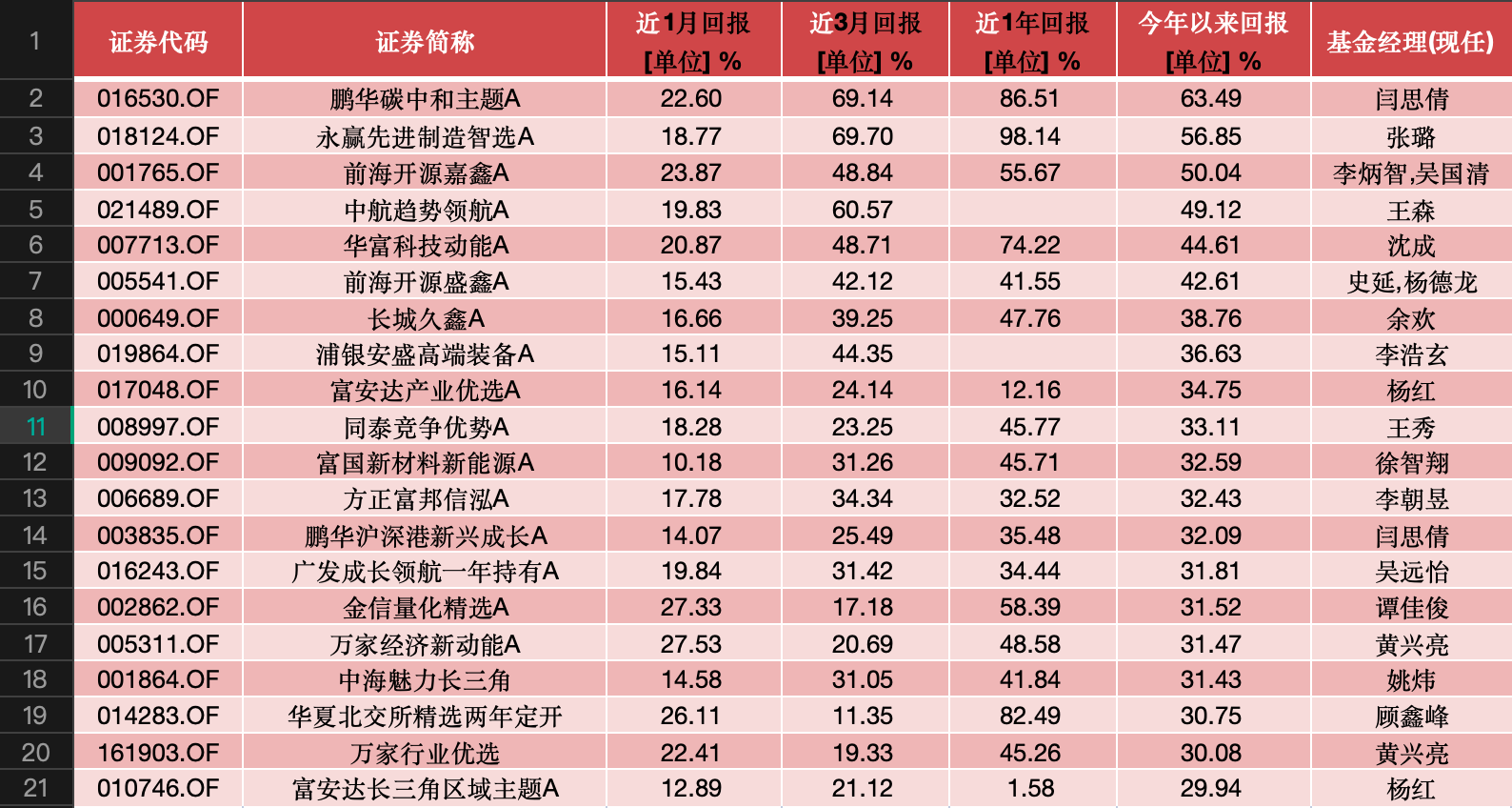 鹏华碳中和主题混合,无疑是今年业绩最猛的基金。截至本周四(2月27日),该产品年内涨幅高达78%,近三个月涨幅98%,近6个月涨幅168%,均为混合型基金排名第一。