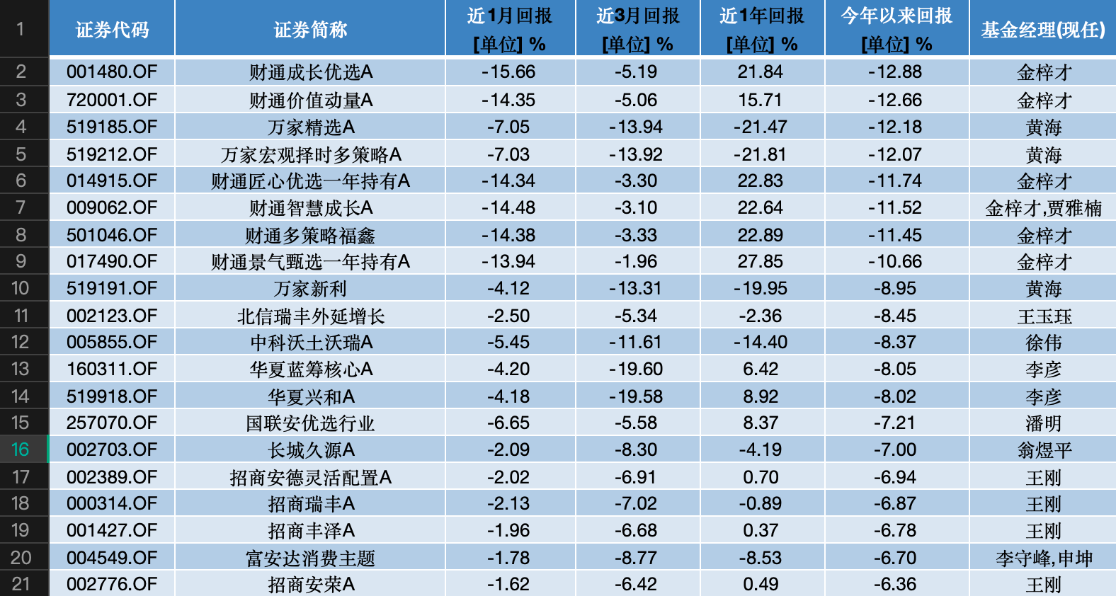 再看混合型基金的跌幅榜,财通基金知名基金经理金梓才管理的多只产品进入榜单。其中,财通成长优选业绩排名垫底,有点让人意外。