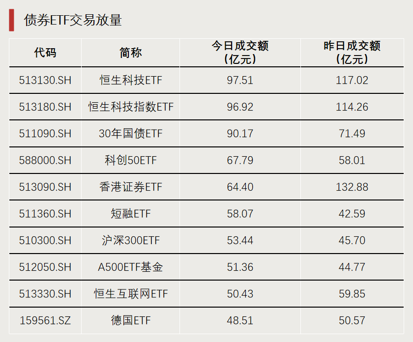 此外,债市回暖带动多只债券ETF交易活跃,30年国债ETF(511090)成交额超90亿元,短融ETF(511360)成交额超58亿元,均较昨日增加10亿元以上。