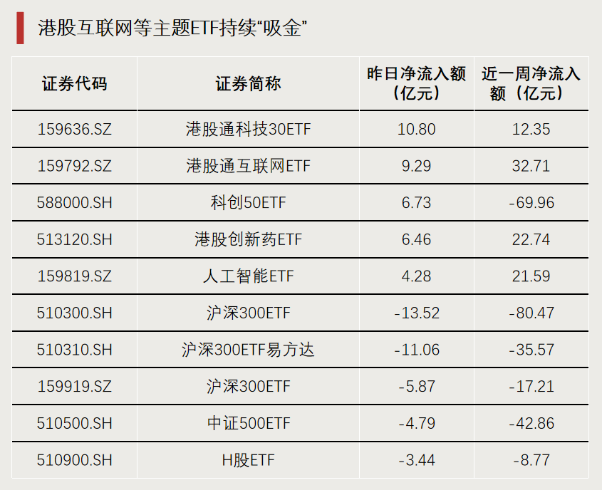 与此同时,沪深300ETF等龙头宽基ETF则持续遭遇资金净流出,沪深300ETF(510300)、沪深300ETF易方达(510310)昨日均净流出10亿元以上,近一周沪深300ETF(510300)已净流出超80亿元,同样位居ETF首位。